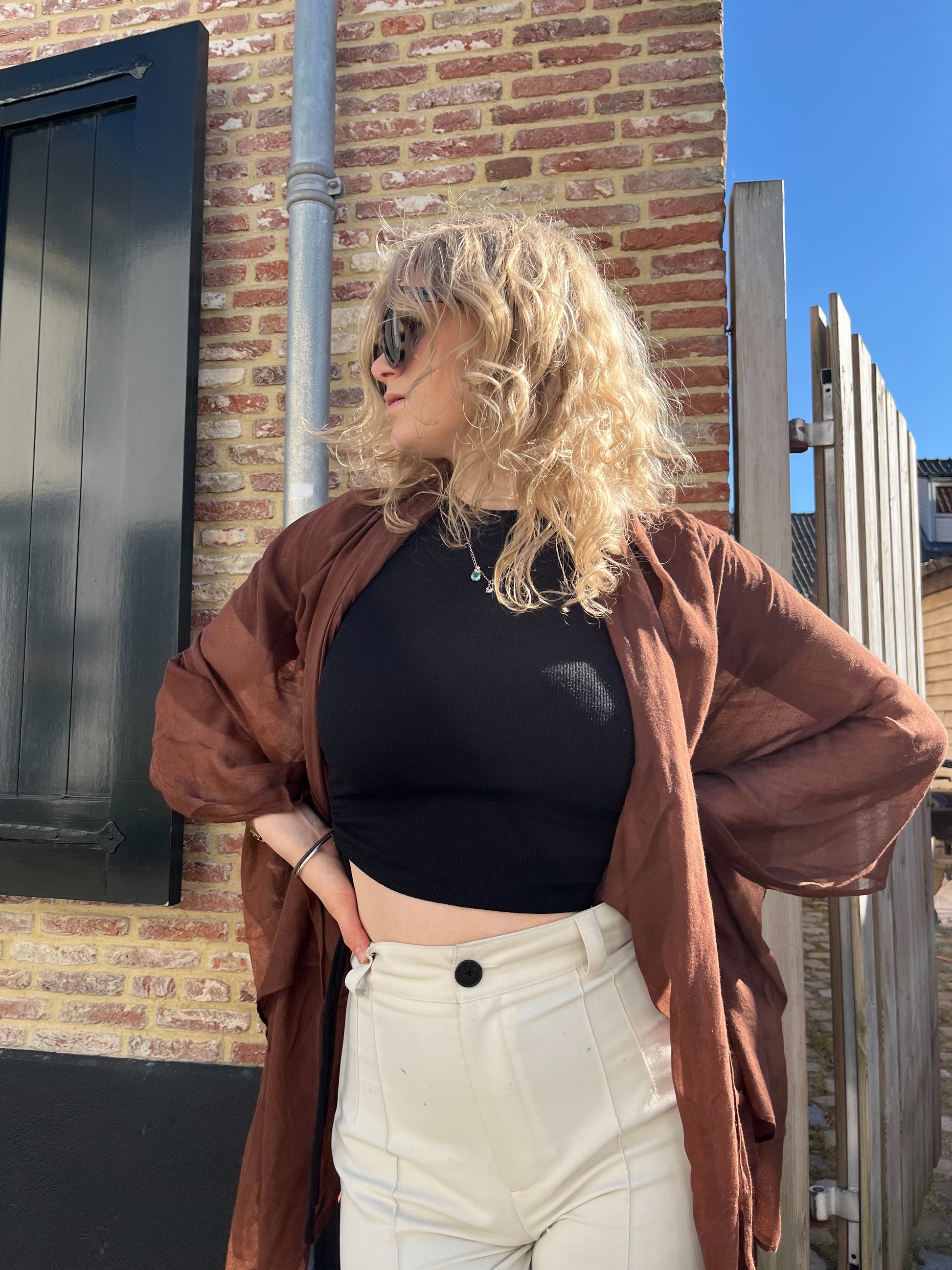 This plain brown scarf is a perfect summer scarf, the scarf is translucent and lightweight. The color is brown which is a perfect combination with the translucent scarf. The lightweight fabric with a combination of the softness of the silk makes the scarf perfect for summer.