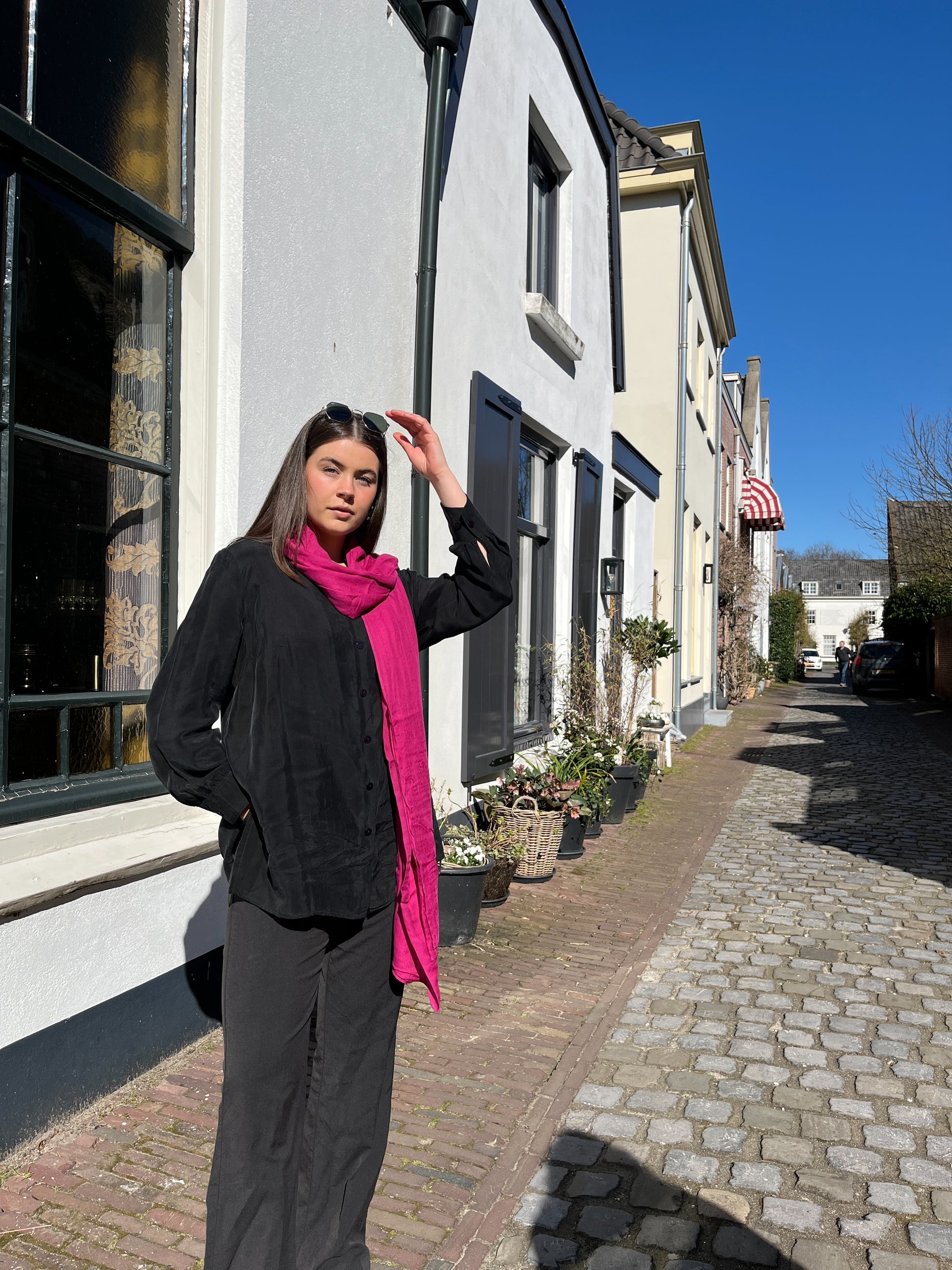 This plain fuchsia scarf is a perfect summer scarf, the scarf is translucent and lightweight. The color is fuchsia pink which is a perfect combination with the translucent scarf. The lightweight fabric with a combination of the softness of the silk makes the scarf perfect for summer.