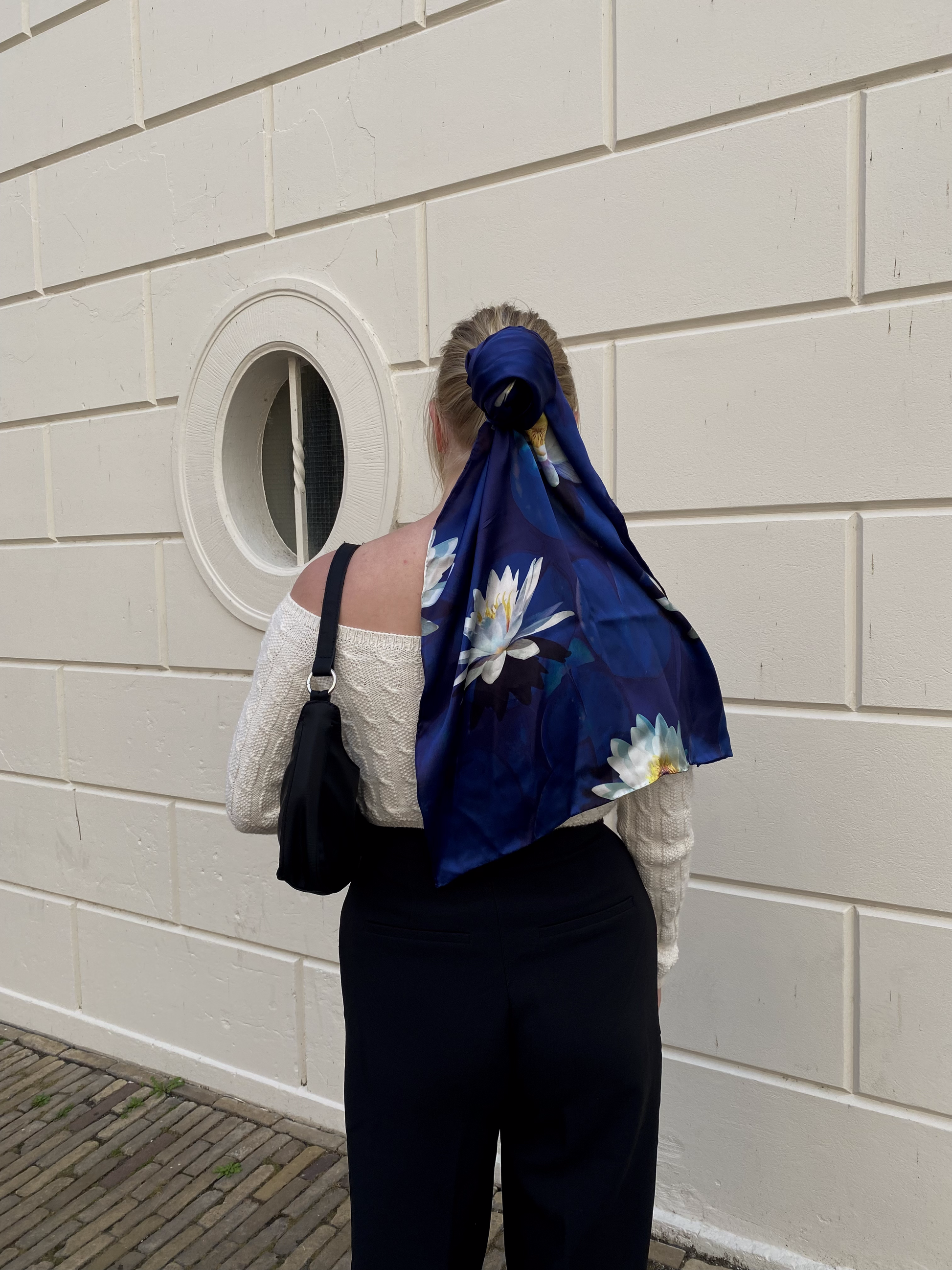 This water lily scarf is made of 100% silk, the scarf is printed on one side and is 160 X 60 CM. The scarf is dark blue and contains a unique pattern of the water lily. The water lilies on the scarf have an overflow to the deep blue color (this symbolizes the water). The leaves of the water lily are also incorporated in the design. The pattern has been designed with love and attention to create something unique and timeless.